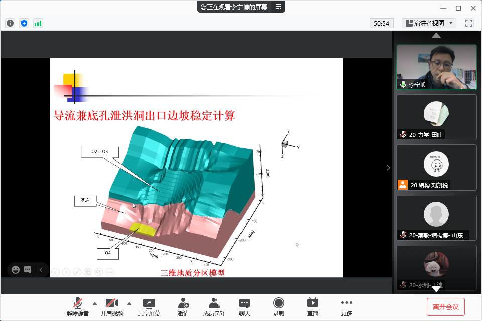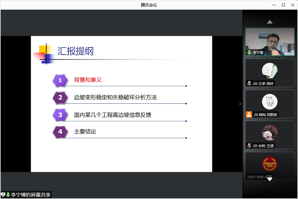 2021年3月22日,由beat365正版唯一官方网站研究生院、党委研究生工作部主办,beat365正版唯一官方网站承办的2021年第18期(总第1007期)“稷下风”研究生学术讲坛在线上腾讯会议成功举办。本次讲坛有幸邀请到了李宁博高级工程师,高级工程师李宁博的汇报题目是《高边坡失稳分析与探讨》。此次讲坛由beat365正版唯一官方网站的副院长韩勃主持,部分老师及研究生参加了此次学术论坛。