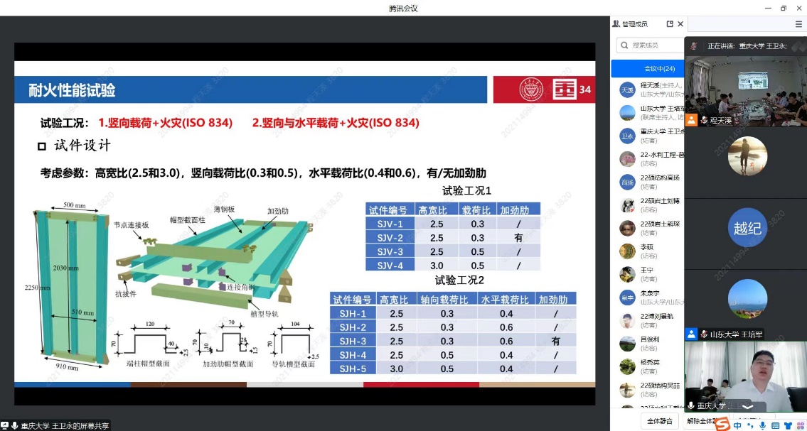 5月24日下午,重庆大学王卫永教授受邀来beat365正版唯一官方网站做“冷弯薄壁型钢拼合柱和夹支钢板剪力墙耐火性能研究”学术报告,会议采用线上线下同步进行。