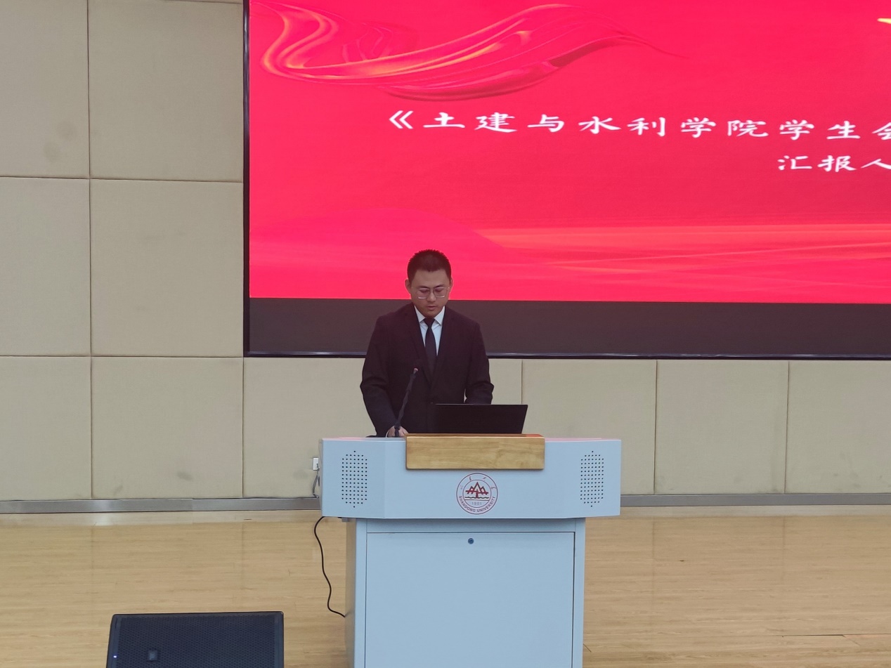 王超代表学院向大会的顺利召开表示热烈祝贺,对过去一年学生组织的工作给予肯定,并向学生代表提出了三点建议。主席团成员林起茂做《beat365正版唯一官方网站第四次学代会代表资格审查报告》与《beat365正版唯一官方网站第四次学代会提案报告》,汇报会前收集的学生提案情况,并表示将进一步依据提案内容开展工作,确保同学们各项权益得到保障。学生会执行主席何金文做《beat365正版唯一官方网站学生组织2023-2024年度总结》,从学生会建设、各项活动开展、校院与院院联动等方面汇报了2023-2024年度的学生工作情况。