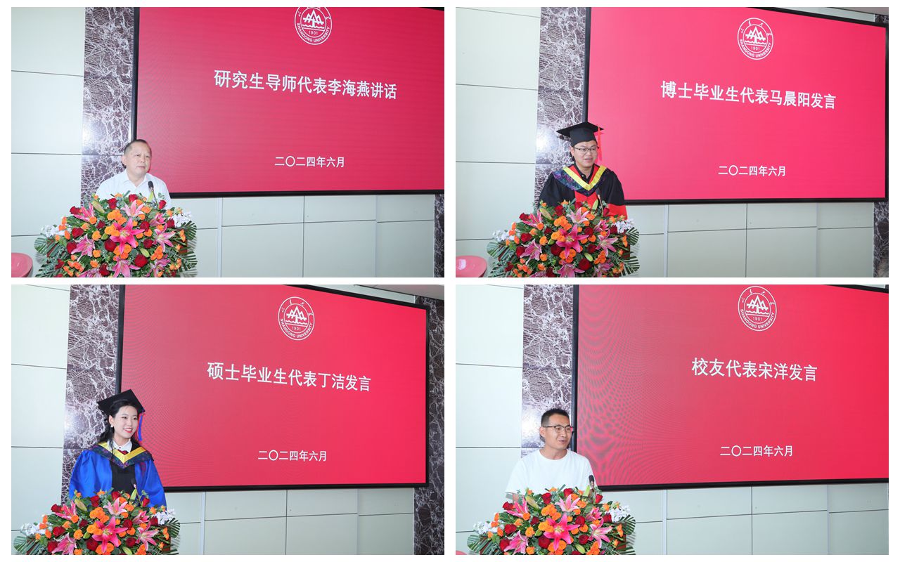 研究生导师代表李海燕勉励毕业生们步入人生新征程之际,要保持终身学习,持续创新;艰苦奋斗,勇于挑战;不忘初心,锤炼高尚品格。他希望毕业生们能够怀揣远大理想,不断挑战自我,在人生的道路上留下精彩的篇章。