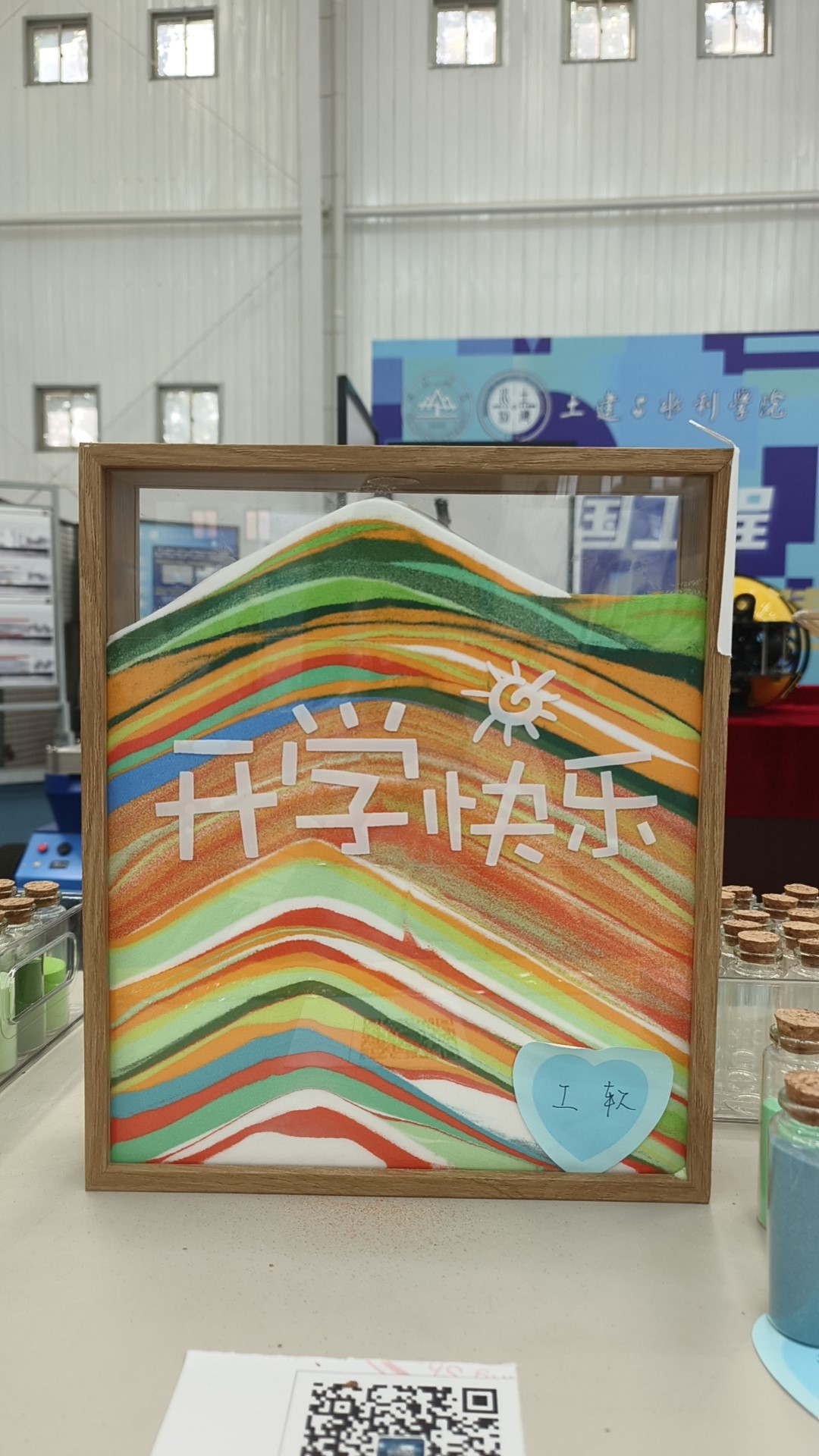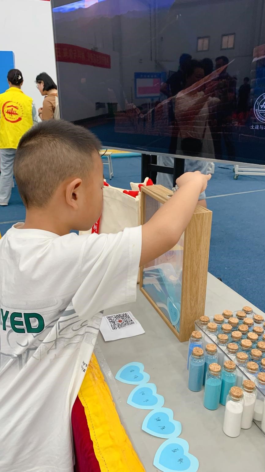 许愿处按照学院招生大类专业分别设置工程软件与土木类“开学快乐”相框,不同颜色的流沙瓶代表不同的美好期许,新生签到后沿参观路线,到达许愿处,选择自己的愿望倒入相框内。