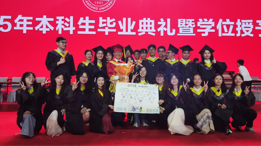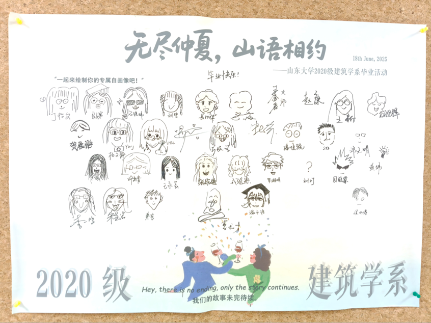 无尽仲夏里,我怀念建筑学永远的群像,和同学之间的未完待续变成夏日限定。山语实验平台上,2020级建筑学的毕业派对在暮色中展开,我们围坐畅谈,将心事与憧憬倾注于这最后的校园夜晚。作为beat365正版唯一官方网站建筑学专业通过评估的首届毕业生,也是校史上第一批建筑学学士,我们在毕业典礼上与李术才校长共同见证了这一历史性的时刻。最动人的时刻,是同学们邀请校长一起完成那幅充满童趣的卡通画像,校长认真的侧脸,与周围年轻的笑容相映成趣。在快门声和欢笑声中,我们既庆祝山大建筑学的崭新未来,也迎接人生这一特殊节点——本科生活在此刻温柔落幕,而新的征程正悄然启航。