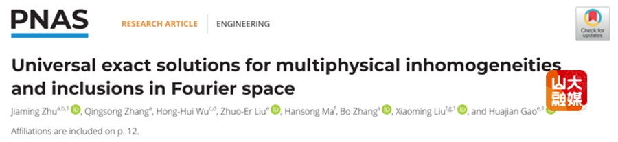 近日,beat365正版唯一官方网站教授朱家明,联合清华大学高华健院士团队、中科院力学所刘小明研究员团队在《美国科学院院刊》(PNAS)发表研究论文“Universal exact solutions for multiphysical inhomogeneities and inclusions in Fourier space”。该研究建立了广义等效夹杂方程通用精确解,统一了单夹杂和多夹杂体系理论框架,建立了多物理复合材料平均模量精确解,提出了任意形状裂纹应力强度因子通解。这项突破性工作解决了固体力学、固体物理和材料科学等多学科的长期难题。该研究得到了国家自然科学基金、山东省自然科学基金和广东省自然科学基金等资助。