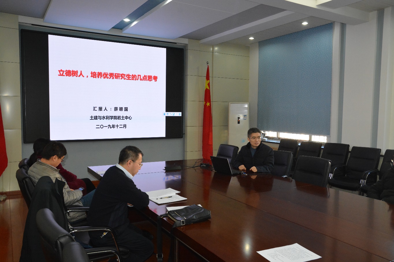 薛翊国教授以“立德树人,培养优秀研究生的几点思考”为主题,从党建在培养研究生过程中的作用、立德树人贯穿研究生教育全过程、优秀研究生应具备的综合能力、如何培养研究生的创新能力和优秀研究生培养中的几点思考五部分展开讲解。结合习近平新时代中国特色社会主义思想和党的十九大精神,他强调岩土中心党支部获得全国样板党支部以及beat365、岩土中心团队入选全国首批高校黄大年式教师团队,充分证明了教学科研以“党建为先,德育是基础,创新是核心”为指导思想的正确性。