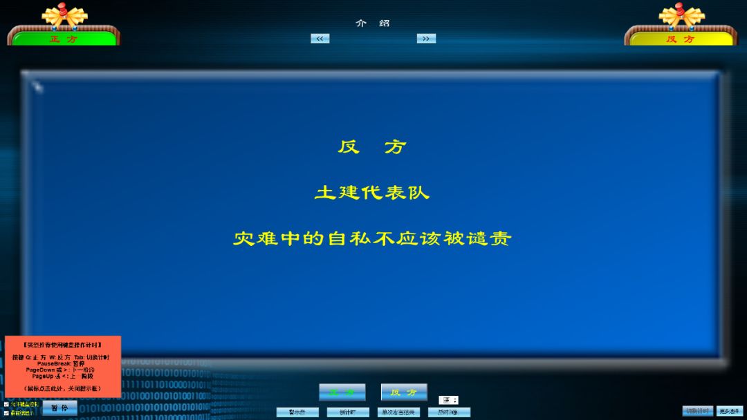 下午2点,短暂适应了网上辩论环境与操作系统后,辩论赛正式开始。首先由正方一辩进行开题陈词。正方先声夺人,从定义出发,人类行为分为“自私行为”“正常行为”“无私行为”三种,为接下来的论辩打下基础。反方则在道德层次立意,强调在灾难这一特殊情景中,人类展现出的更多是求生欲望与生物本能,若站在道德高地上加以谴责,则不免有求全责备之嫌。