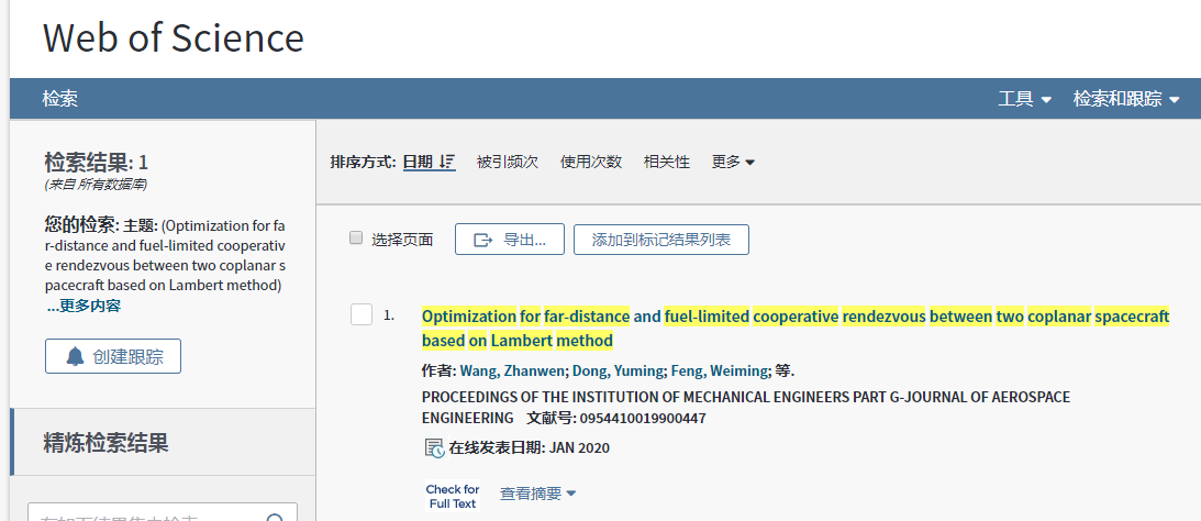 近日,beat365正版唯一官方网站beat365工程力学专业本科生汪展文和董禹铭在英国《航天工程期刊》(Proceedings of the Institution of Mechanical Engineers, Part G: Journal of Aerospace Engineering)发表了题为《基于Lambert方法的共面航天器远程协同交会的优化》的论文,并被SCI收录。