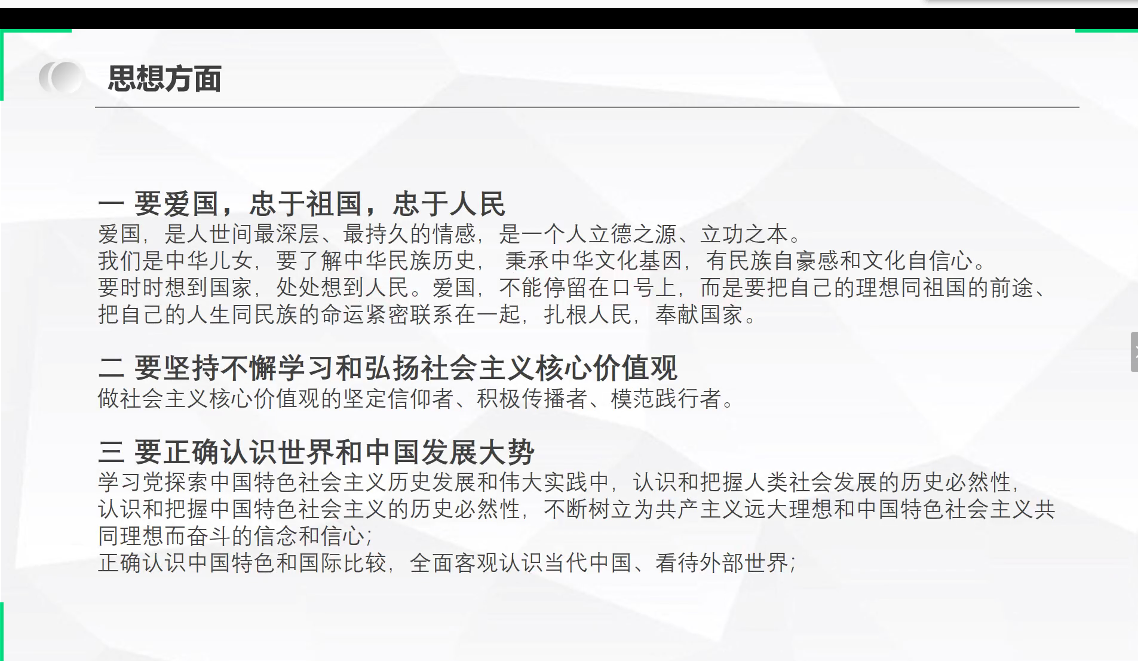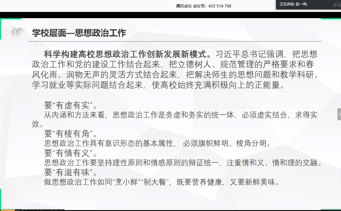 最后,李梦筱介绍了教师层面和学生层面的具体措施。她提出,建设高素质教师队伍,学生要爱国,忠于祖国和人民,坚持不懈学习社会主义核心价值观,正确认识国内国际形势。要立志做奋斗者,求真务实做学问,知行合一做实干家。