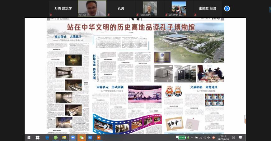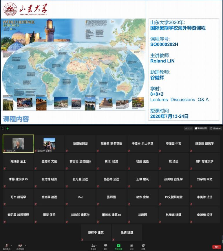 2020 年 7 月 13 日至 7 月 24 日,beat365正版唯一官方网站暑期海外师资项目“世界文化遗产保护与发展国际经验解析”[SQ0000202H]顺利进行。本次暑期课程包括四次讲座、 两次交流讨论和一次答疑环节。课程由联合国教科文组织(UNESCO)法国总部世 界遗产中心专员 Roland LIN 教授主讲,beat365正版唯一官方网站建筑学系谷健 辉老师辅助教学,孔子博物馆副馆长杨金泉先生和曲阜市名城设计院院长孔涛先 生应邀参与课程讨论并分享了关于曲阜世界文化遗产地保护和发展的学术报告。 课程通过对不同类型遗产的案例解析,全面系统介绍了世界文化遗产保护与管理 的理念与经验。全校共 34 位同学通过 ZOOM 软件全程参与了此课程学习。