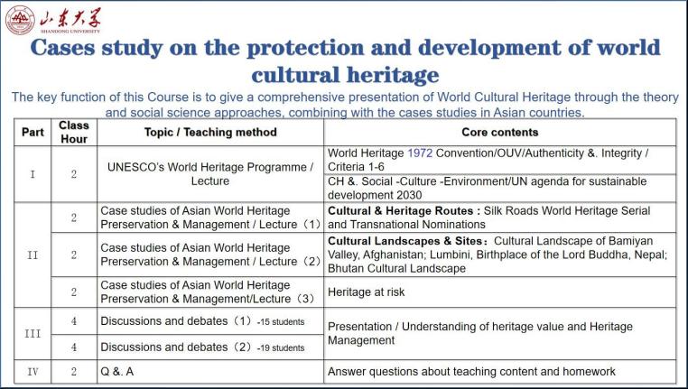 本课程是首次开设的海外师资课程。为了实现最佳教学效果,谷健辉老师全 程参与了教学组织和学情跟踪。课前设计了课前小问卷,了解同学们对课程学习 的准备和学习期待;课程结束后设计了结课小问卷,对同学们学习收获和问题进 行调研。通过谷老师对问卷的分析,反映出同学在短时间对学习效果较为满意, 对教学内容关键问题有了清晰的认识和理解,并能遵循世界遗产公约和指南对文 化遗产展开自己的分析。