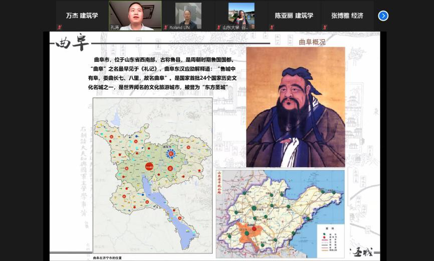 课程第六天,谷健辉老师和 Roland LIN 教授特别邀请孔子博物馆副馆长杨 金泉先生和曲阜市名城设计院院长孔涛先生为同学们带来关于曲阜世界文化遗 产地保护和发展的精彩报告。两位专家结合多年在曲阜世界文化遗产保护和城市 发展的工作经验,系统讲述了曲阜文化空间的蕴含的深厚历史和孔子博物馆的陈 列策展策略,分析了区域文化视角下曲阜城市空间发展定位,并结合曲阜实际情 况对文化导向的城市规划实践和探索进行阐述。这两场报告使同学们对曲阜世界 文化遗产地的历史文化以及保护现状有了深刻认识。两位专家报告结束后,还参与了同学们的展示汇报,并给予了极具建设性的点评。