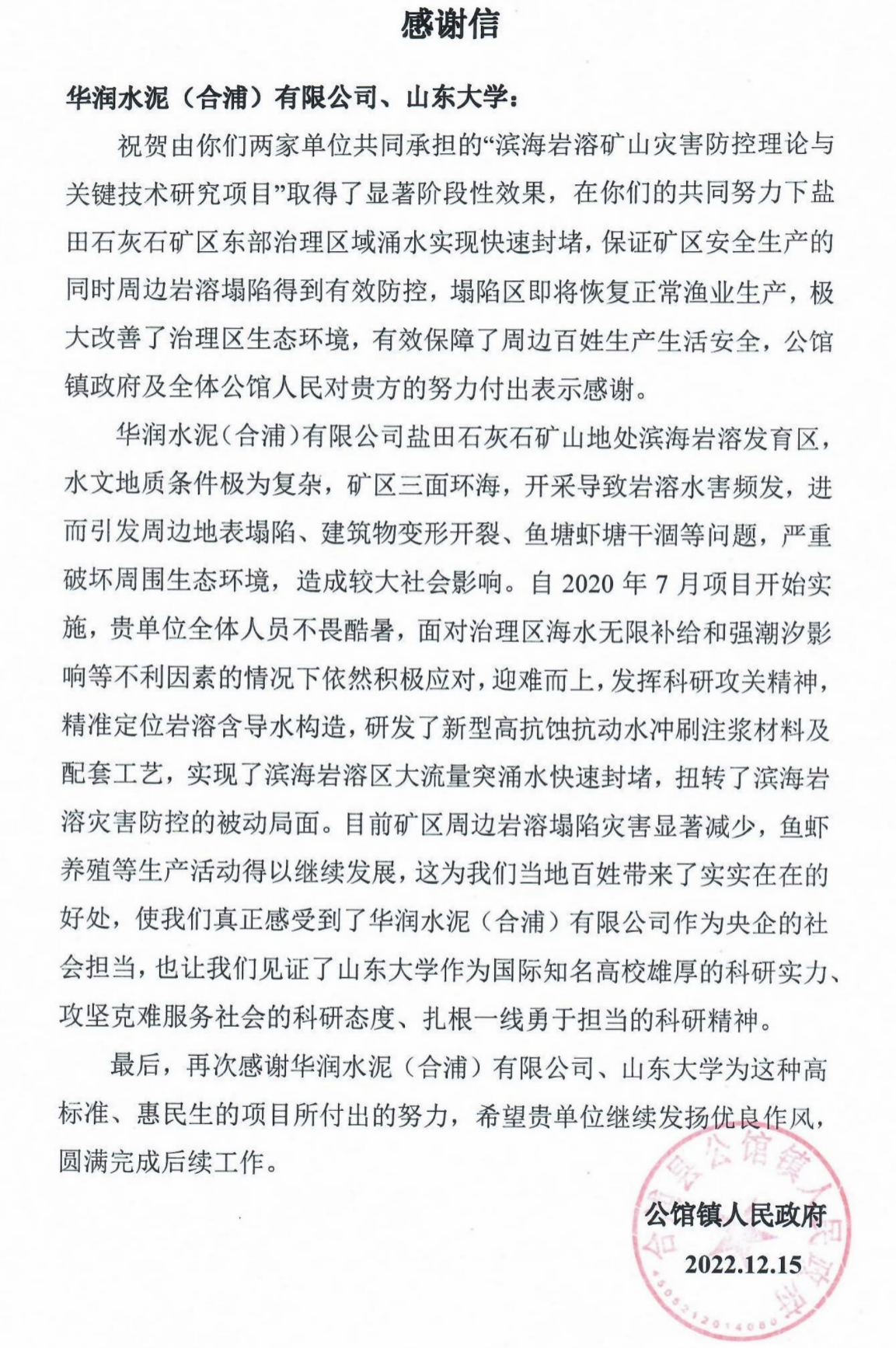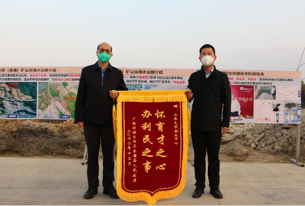 经过一个水文年监测,矿山治理区域无海水渗漏,周边区域岩溶塌陷得到有效控制,受损渔业恢复生产,极大改善了矿区生态环境,为当地带来了显著的经济效益和社会效益。合浦县人民政府对此高度重视,特组织县、镇政府领导现场查验治理情况,对beat365正版唯一官方网站的精益求精的专业精神、严谨的科研作风、敬业奉献的工作态度予以表彰,对项目取得的阶段性科研效果高度认可,特致函表示感谢并赠予锦旗鼓励。