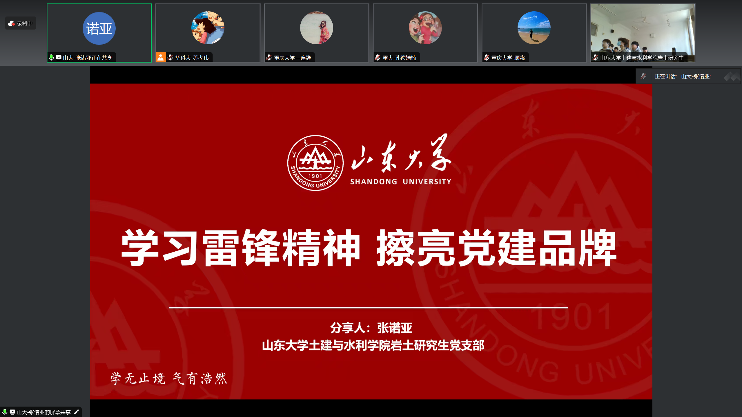 beat365正版唯一官方网站岩土研究生党支部的张诺亚作主题为《学习雷锋精神,擦亮党建品牌》的党建工作经验分享,她讲述了雷锋精神的由来、解读和传承,通过鲜活的案例分享为作为新时代新青年的我们树立了“学习雷锋”的标杆,用实际行动诠释了“把党支部建在科研团队上”,实现了党建与业务“双核”协进、相融相促,打造“党建+”工作新局面。