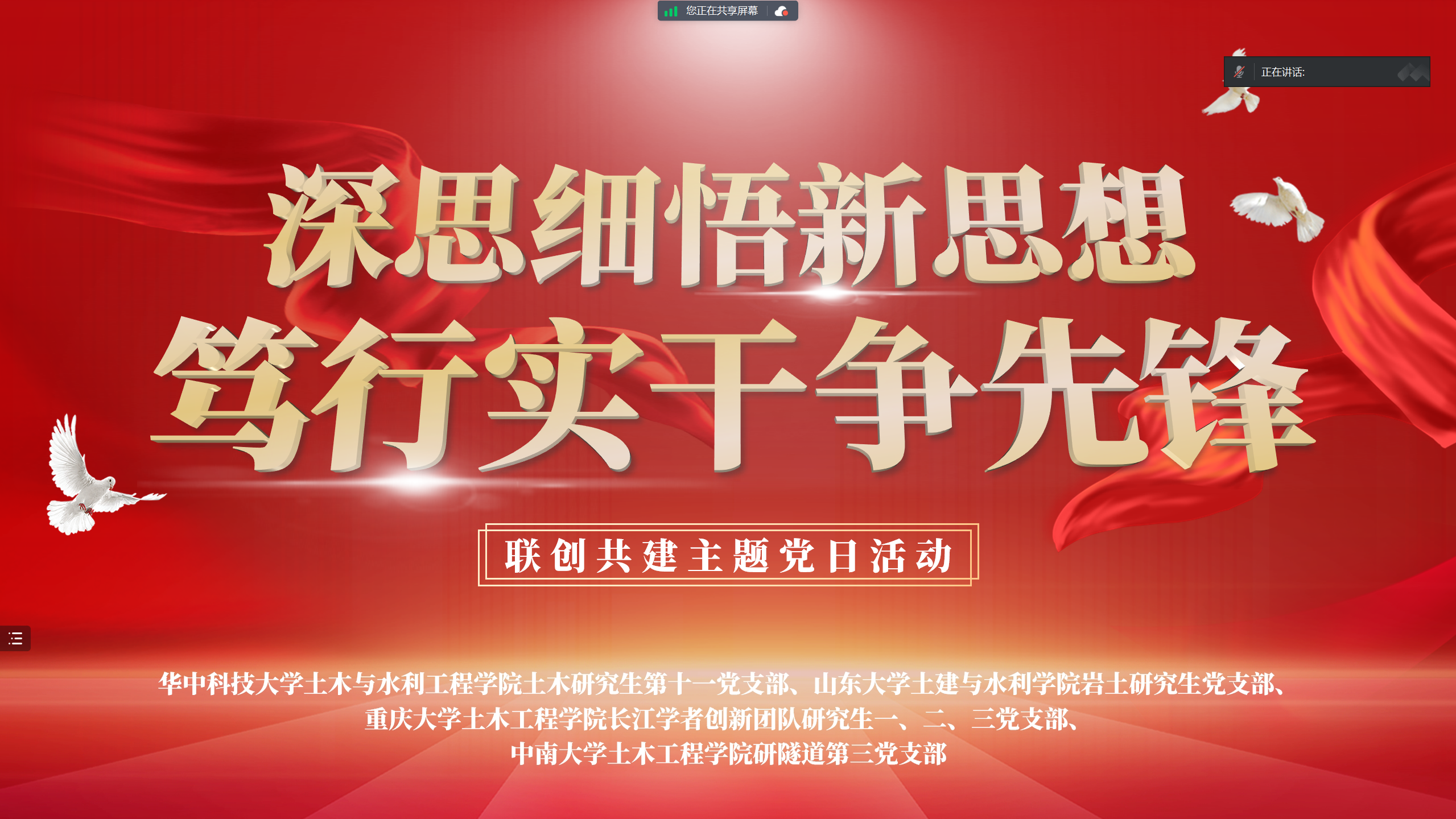 beat365正版唯一官方网站岩土研究生党支部、华中科技大学土木与水利工程学院土木研究生第十一党支部、重庆大学土木工程学院创新团队研究生一、二、三党支部、中南大学土木工程学院隧道第三党支部“线上会议+线下会场”超200名学生党员参加活动。
