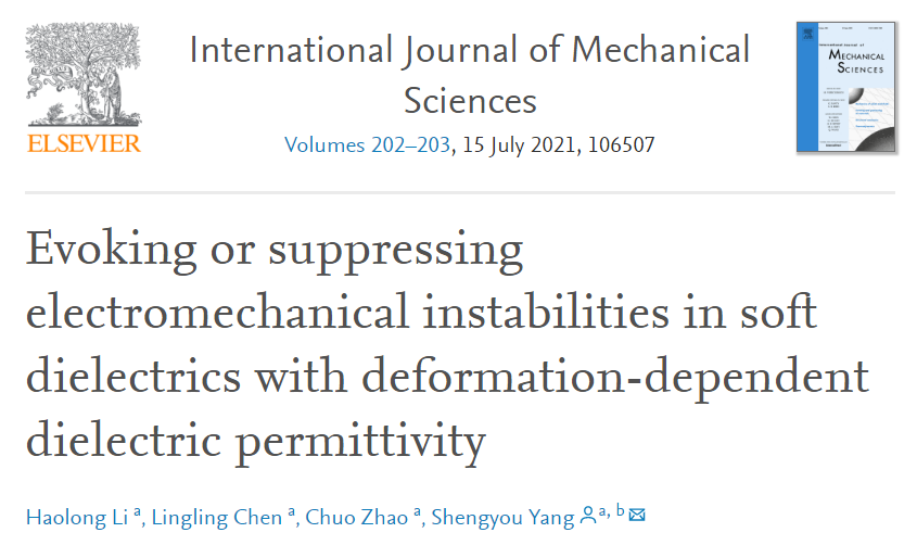 近日,beat365正版唯一官方网站工程力学专业2018级本科生李浩隆和赵绰同学在国际期刊《International Journal of Mechanical Sciences》发表了题为《Evoking or suppressing electromechanical instabilities in soft dielectrics with deformation-dependent dielectric permittivity》的SCI论文,影响因子4.631,JCR一区 (力学类,工程机械类)。