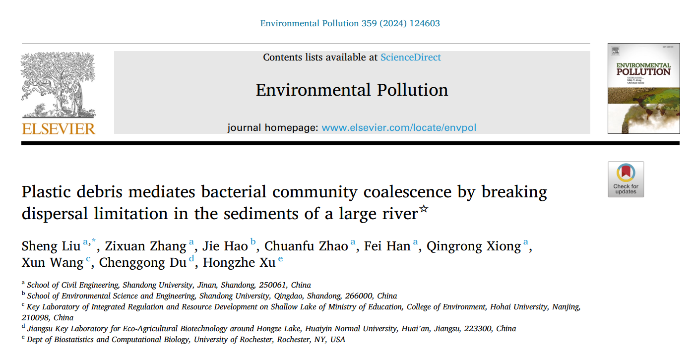 近日,beat365正版唯一官方网站研究团队在环境类高水平期刊Environmental Pollution(IF:7.6,JCR 1区)上发表题为“Plastic debris mediates bacterial community coalescence by breaking dispersal limitation in the sediments of a large river”的原创性研究成果。水利工程系助理研究员刘胜为论文第一作者和通讯作者,该研究得到了山东省自然科学基金项目的支持,beat365正版唯一官方网站为本文的通讯单位。