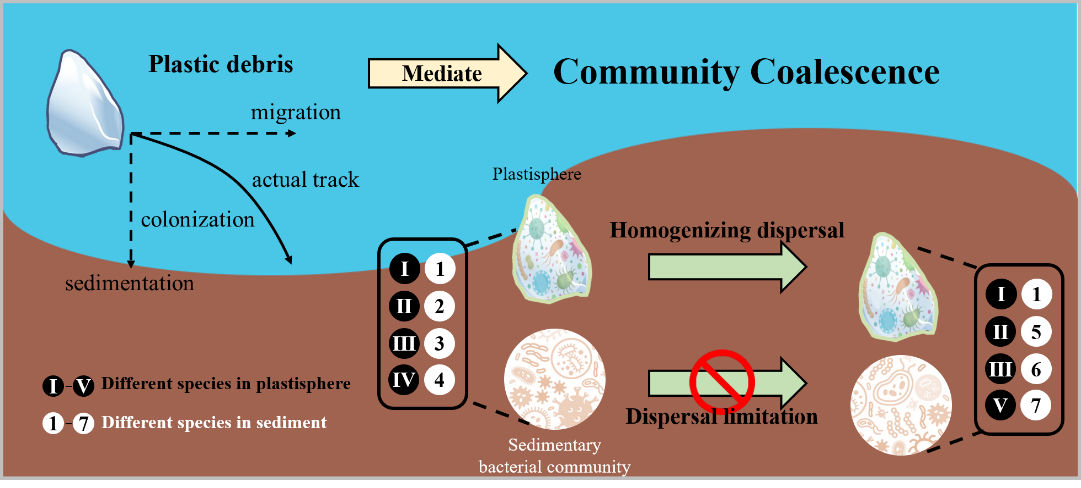 微塑料作为微生物定殖的新型载体,其在河流中的水平迁移并最终埋藏进入沉积物势必会对河流微生物生态产生影响。然而,群落融合作为一种涉及多个群落及其周围环境相互关系的普遍过程,在揭示微塑料及其携带微生物对河流微生物生态的影响方面却鲜有报导。本研究揭示了微塑料和塑料圈对河流微生物群落融合的介导作用,发现了微塑料的存在可以帮助微生物打破扩散限制从而进行更长距离迁移,因此加剧了流域微生物生态均质化等潜在生态风险。本研究为流域微塑料生态风险识别提供了新的视角,对推动流域生态环境保护和高质量发展起到了促进作用。