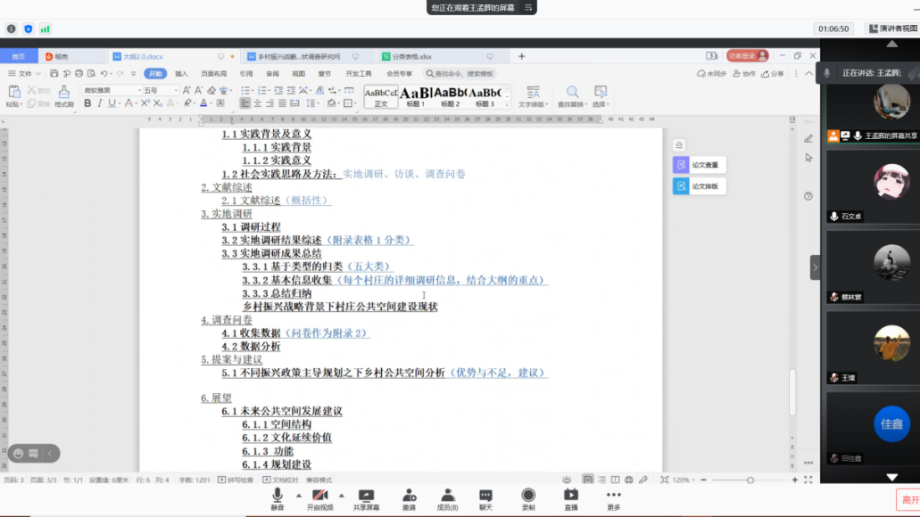 会议开始,王孟晖首先向团队成员明确了本次社会实践总共分成前期准备、个人调研、后期工作三部分。在前期问卷调研分析过程中,团队对收集到的数据进行了清晰、有效的分析与梳理,认识了乡村振兴战略背景下多个乡村公共资源的发展管理现状,得出了一系列有研究价值的结论与问题雏形。团队成员各自负责的村庄研究也在有条不紊地进行。经过调研,成员们完成了对十个村庄的基本信息收集,确定了其振兴类型,通过分析不同振兴政策主导规划之下乡村公共空间,给出了乡村振兴战略背景下建设村庄公共空间的建议。
