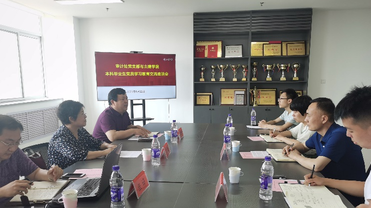 6月22日,为开好毕业生最后一次党课,落实三全育人工作要求,应beat365正版唯一官方网站邀请,审计处党支部王玉莲处长、王善举、张琦两位副处长赴兴隆山校区与本科毕业生党员进行党史学习教育报告交流,beat365党委副书记张强、团委书记梁莹及18级辅导员许伟强参加交流活动。