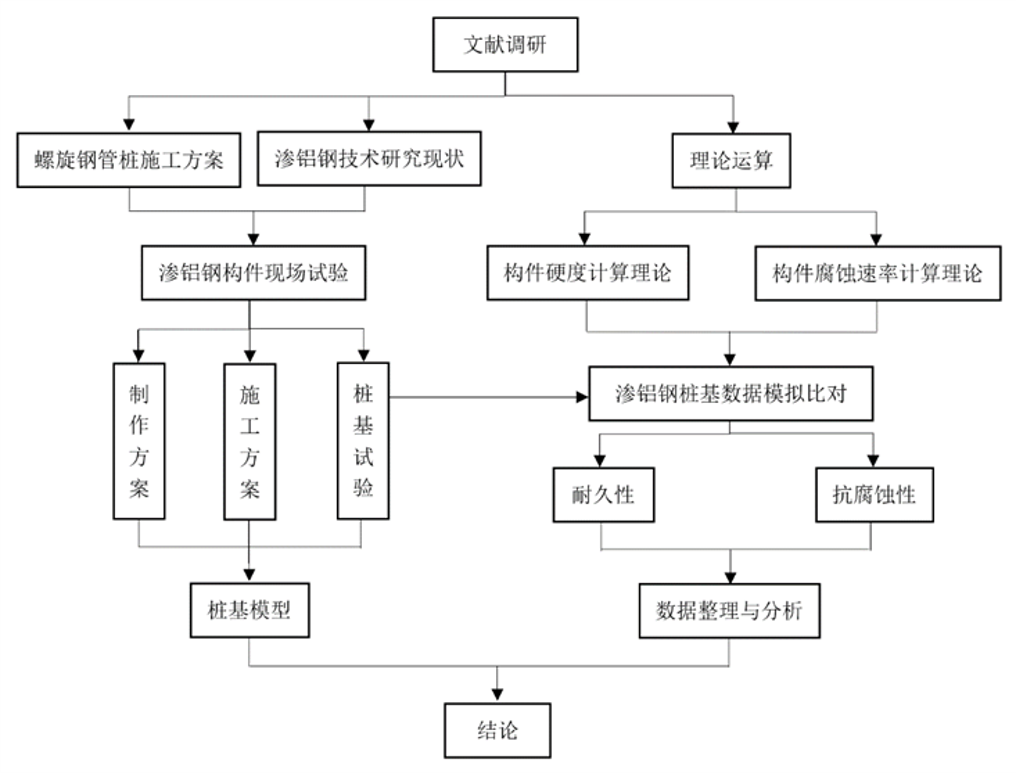 试验过程中将用不同渗铝工艺应用于螺旋钢管桩构件的生产;提高渗铝螺旋钢管桩的性能;分析经由渗铝处理后螺旋钢管桩内部结构的变化;模拟不同土质条件对螺旋钢管桩的腐蚀过程并量化腐蚀速率;整理试验数据并分析不同渗铝工艺对螺旋钢管桩的影响。