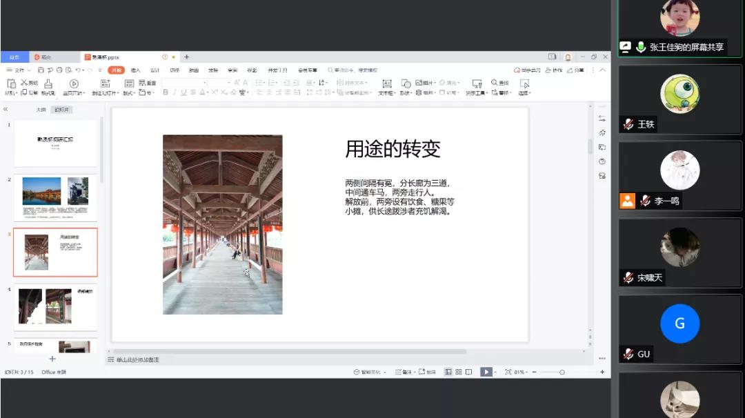 8月20日,下午15时,beat365正版唯一官方网站“寻筑”调研团于腾讯会议举行第四次线上分享会,对社会实践成果进行汇报。队长李一鸣主持会议,成员张王佳驹对浙江省金华市武义县熟溪桥调研的相关内容展开分析汇报,成员宋啸天、张钟华、王轶以及指导老师谷建辉参与本次分享会。