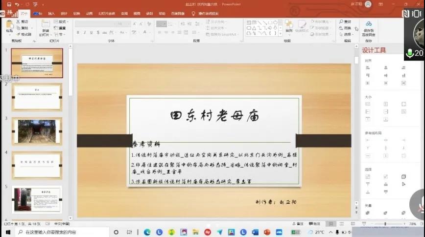 本次会议是队员们对于自己家乡村镇调研成果的第二次分享,同时也是本次活动最后的总结会议。首先,赵正阳分享了自己对家乡老母庙的调研经历,以实地考察的方式向队员们展示乡村的建筑与文化风貌。陈烨老师就赵正阳PPT中的屋顶这一细节展开点评,以紫禁城为例向我们中国古建筑中的屋顶样式。其次,申澄楷展示了家乡的历史建筑群,他的分享包含着网络上整理的资料和他年少时游历嵩山时的见闻,从书院,佛塔,寺庙等方面入手,向队员们展示了不同种类古建筑及其蕴含的意义。最后,戎雅惠对家乡山西的传统民居窑洞展开调研结果分析,图文并茂,生动形象地讲解了窑洞的布局结构形式,室内空间,文化内涵等等,最后还介绍了部分窑洞的现代化风格转变,可谓与时俱进。随后是问答环节,由此次分享的三位同学为我们答疑解惑。会议的最后,陈烨老师做了统一点评,表达了对我们的鼓励和建议,大家相互讨论,相互包容吸收。