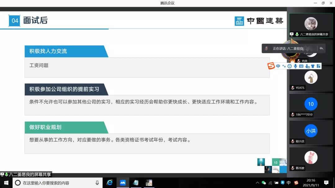 9月11日晚8时,beat365正版唯一官方网站“学长学姐说”就业经验分享会顺利举行。会议由beat3652018级辅导员助理肖英和金霄主持,邀请了2017级土木工程毕业生就职于中建八局二公司姜易良和就职于中建八局华北公司吕玥担任分享嘉宾,18级全体同学参加。