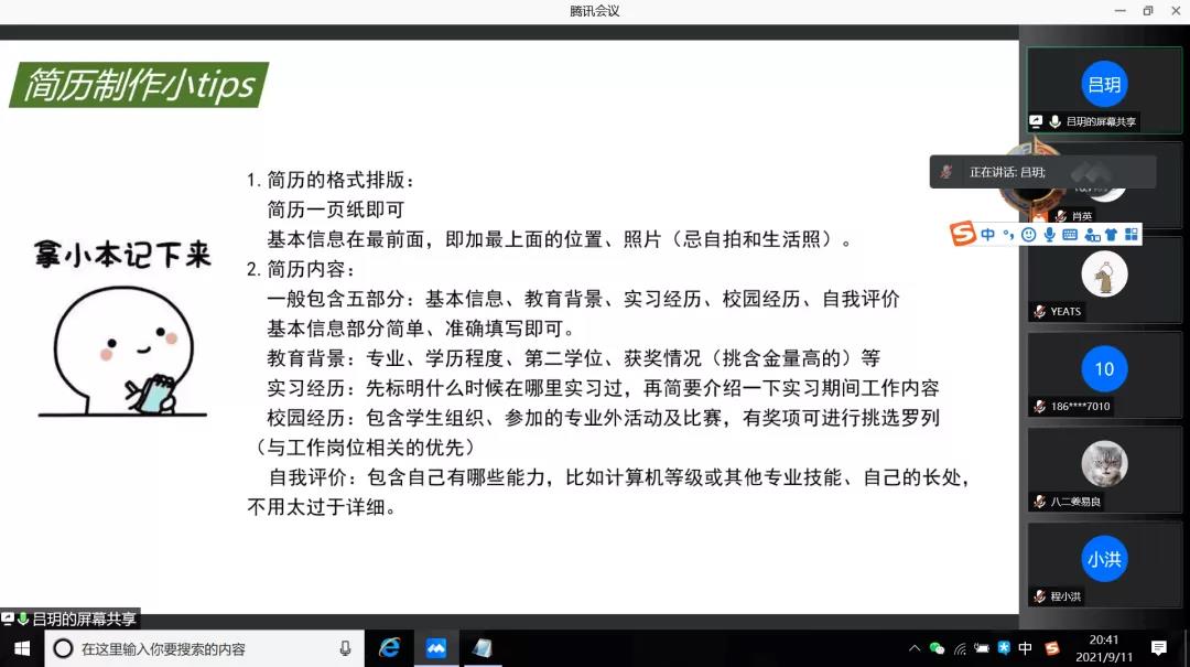 本次经验分享会以线上会议形式展开,旨在通过往届优秀毕业生的经验分享帮助选择就业的同学提升就业技巧,获取就业信息。经验交流会分三部分进行:嘉宾就职公司介绍、经验分享以及答疑解惑。会议伊始,主持人对嘉宾就职公司的组织架构和经营布局进行简要介绍。随后,姜易良就自身就业经历与感想进行分享,强调了就业前心态的调整以及简历制作的重要性,同时也分享了许多面试常见问题和步入工作后的心得。吕玥则从就业方向选择、简历制作内容、面试礼仪与着装、实战经验四个方面展开了详细介绍,为同学们提供了精细的简历制作步骤,并规避了许多就业过程中应聘流程的“雷点”。最后,在提问环节,同学们与两位分享人进行了热切的互动,两位嘉宾为大家一一解惑。