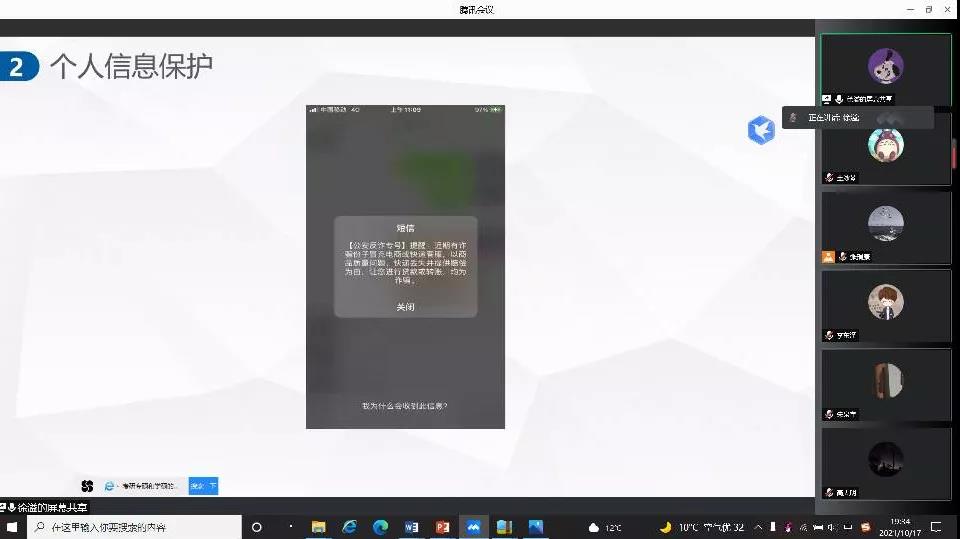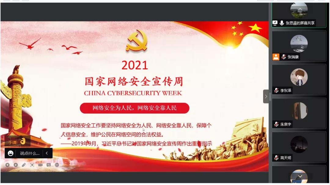 为贯彻落实中央关于网络安全和信息化的战略部署,加强党员同志树立网络安全自我保护意识,提高网络安全防范技能。10月17日晚,beat365正版唯一官方网站本科生第一党支部于线上开展“网络安全为人民,网络安全靠人民”主题党日活动。本次活动由张瑞康主持,张思遥、高天明、徐溢、张晋分别从不同角度分享近期学习体会,支部全体党员参加活动。