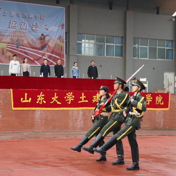 随着《运动员进行曲》响起,开幕式正式开始。各班班旗在空中飘扬,创意十足的班服在清晨彰显着土建学子的开创精神。方阵前进过程中突降大雨,开幕式不得不暂时中断,所有人员转移到主席台下避雨。在大雨中,韩勃院长致开幕词,强调了体育的重要性,提出作为学生要重视体育运动,要德智体美劳全面发展,以健康的体魄为国工作五十年,最后祝愿运动会圆满举行,友谊第一、比赛第二,赛出友谊、赛出风格。紧接着,裁判代表和运动员代表依次宣誓。随着雨势渐停,体育部同学即刻更改比赛方案:田赛项目延迟进行,取消当天的部分径赛项目,并及时清理径赛项目场地,视情况增减比赛项目。在各方人员的组织努力下,2021年秋季运动会继续进行。