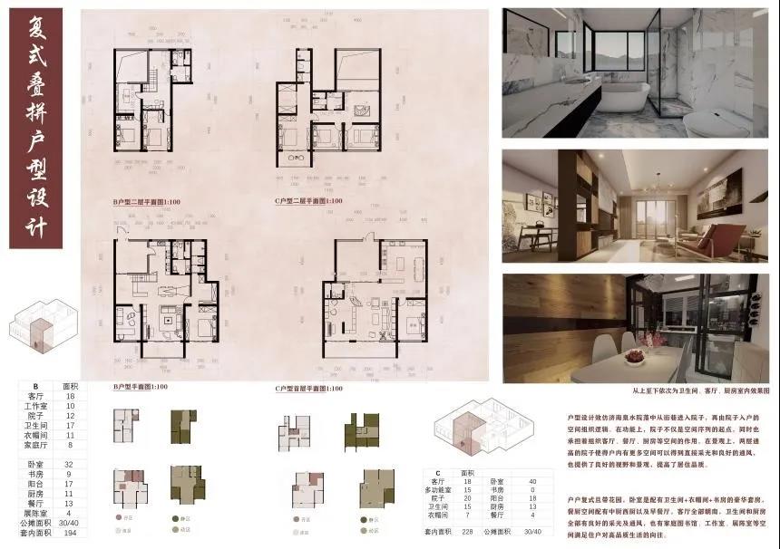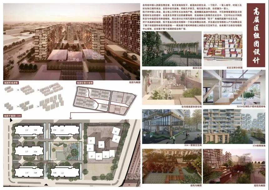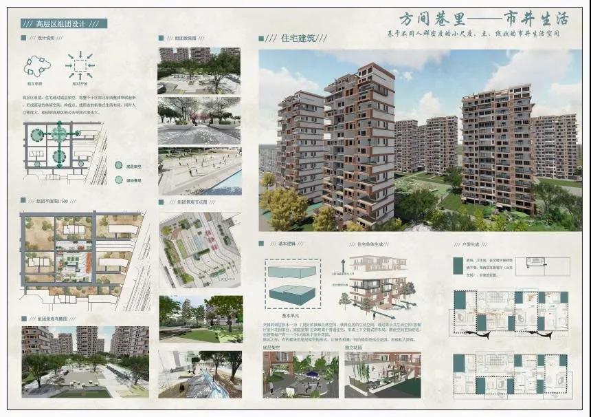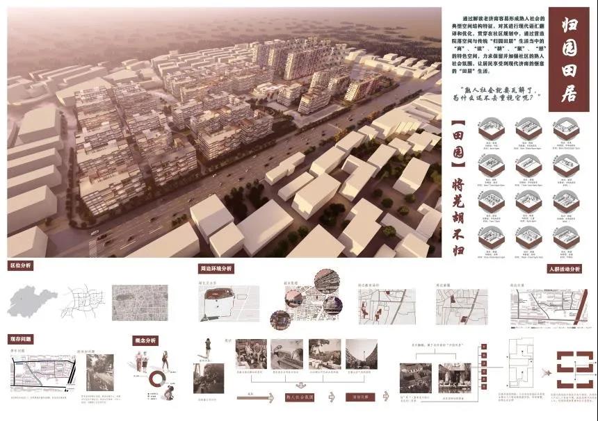 田佳鑫的作品分为住区规划设计和高层住宅楼设计。住区规划设计通过解读老济南容易形成熟人社会的典型空间结构特征,对其进行现代语汇翻译和优化,贯穿在社区规划中,通过营造院落空间与传统“归园田居”生活当中的“商”、“读”、“耕”、“聚”、 “憩”的特色空间,力求保留并加强社区的熟人社会氛围,让居民享受到现代济南的惬意的“田居”生活。