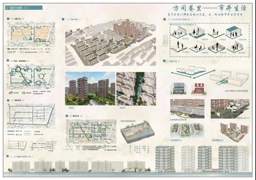 围绕社区布置沿街底层商业的同时,在青后街、报施街、以及山大南路,依托底层商业,向社区内凹内部渗透,形成不同的活动场地。在内部依托街巷布置不同尺度的活动绿地,形成可容纳市井生活的生活天地。