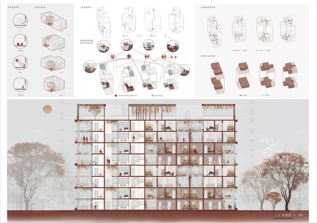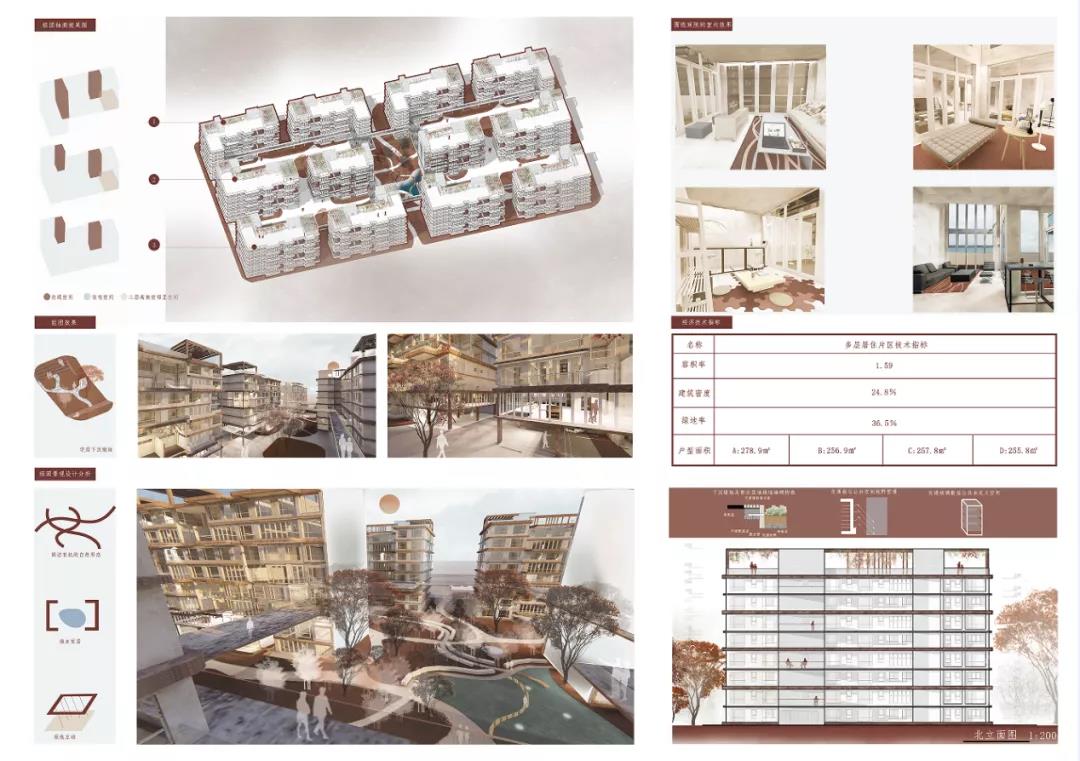 该设计通过引入以曲水亭街为原型的“市井”与“泉水”、功能与环境并置的的空间组织方式,试图形成全龄有效的公共社交活动空间;并分级形成完善的“核心与网点”社交体系,即社区级(5min/中心景观轴+社区商业)、组团级(3min/漫游休憩+便民设施)、单元级(2min/层间共享书屋)、邻里级(1min/邻户共享种植阳台),最终复原老济南“功能有效、年龄并置、自然共生”的传统社交氛围。