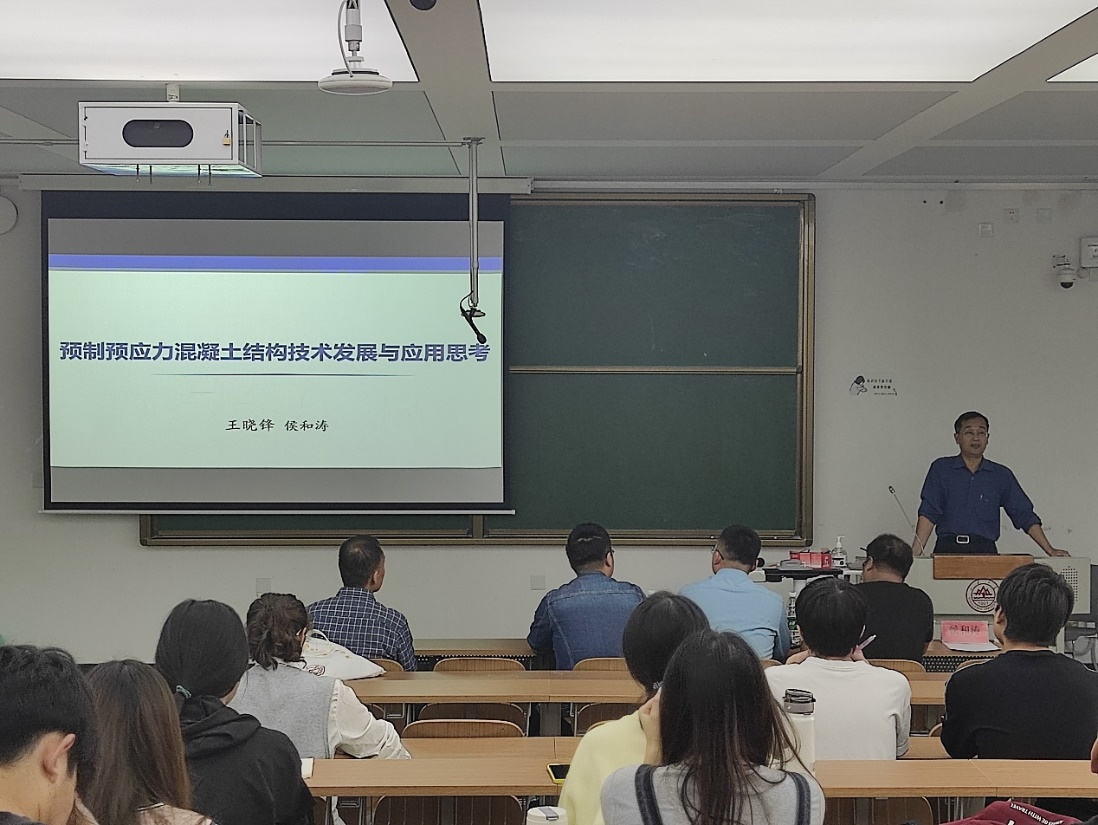 侯和涛从“预制预应力混凝土结构技术发展与应用思考”,“新型SC预应力混凝土叠合板技术研发与应用”两个方面展开讲解。首先,侯和涛介绍了装配式建筑的发展概况,梳理了装配式建筑在材料、技术等方面的发展历程。随后,侯和涛介绍了预应力技术的发展,尤其从预制预应力混凝土楼盖方面着重讲解了它的发展,随着相关技术的不断提高,其承载能力与跨度都得到不断提升。侯和涛通过风趣的语言与丰富的文字图像资料使同学们如临现场,从各方面了解了预制预应力混凝土技术。