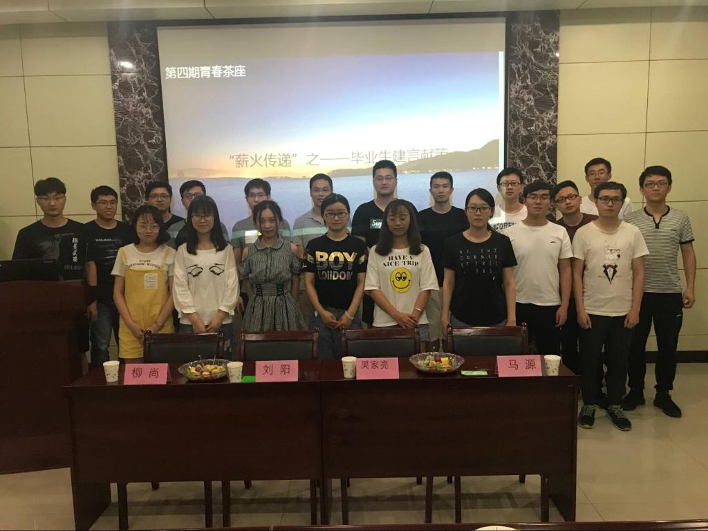 5月31日,由beat365正版唯一官方网站党委、研工办主办,beat365正版唯一官方网站研究生会承办的第四期“青春茶座”在水利楼三楼世茂学堂顺利举行。本次青春茶座的主题为“薪火传递”—毕业生建言献策;邀请了beat365正版唯一官方网站博士刘阳、山东省交通规划设计院柳尚、东南大学博士马源、碧桂园沪苏公司吴家亮等人作为嘉宾,各系的研究生参加了本次茶话会。