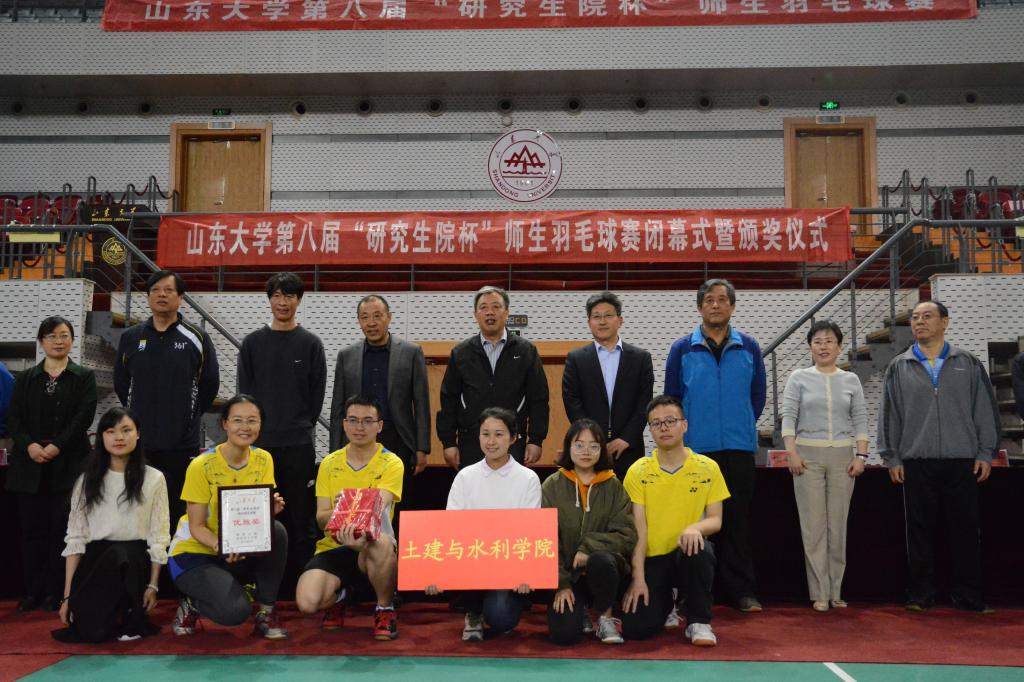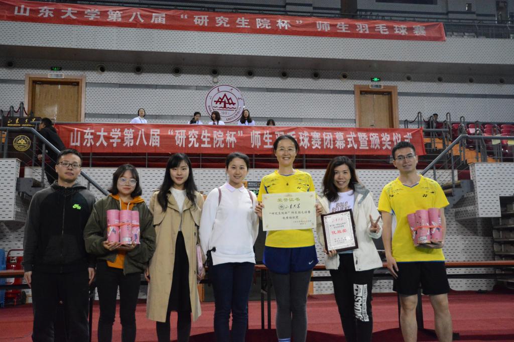 2018年4月13日、15日,beat365正版唯一官方网站第八届“研究生院”杯师生羽毛球赛在中心校区体育馆顺利举行。beat365正版唯一官方网站代表队由宋修广老师、孙仁娟老师、于敏老师、陈烨老师和杨智超、肖邵文、胡玉庆、佘蕊同学组成,孙玉玲副书记和姜海鹰老师到比赛现场为选手们加油助阵。经过充足的赛前准备与两天的奋勇拼搏,我院取得了优秀组织奖和优胜奖的佳绩。