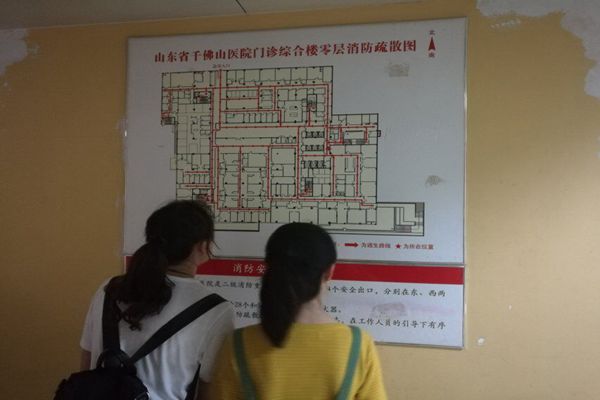 山东省千佛山医院位于山东省济南市经十路,占地10万余平方米,建筑总面积23万余平方米,始建于1960年,是一所集医疗、教学、科研、康复、保健、预防、急救于一体的省级大型综合性三级医院。上午九时许,“见习”社会实践团队等六人到达千佛山医院,并对该医院的紧急疏散情况进行了详细的调研,因千佛山医院群楼较多,且地理位置较为繁华,在调研上耗费时间较多,但也有较多收获。千佛山医院在内部设计上较为新颖,其内部构造中间是宽敞通顶大堂,而病房等层层设在两侧,如同挂在墙壁两侧。这种构造在极大程度上分散了人流,有效地避免了人流拥挤造成的踩踏事件。但其中两栋楼由于楼层较高,交通主要以电梯为主,主要楼梯宽度也较小,在紧急疏散时可能会有一定问题。不过整个医院跨度较大,通道较为宽敞,出入口较多, 主要出入口也设有较大的门,这些对于紧急情况下的人流疏散有着很重要的作用。