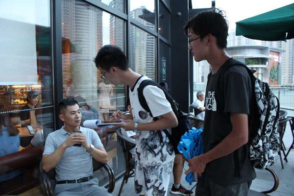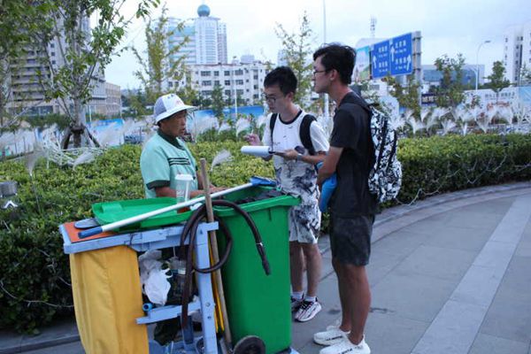 抵达活动地点后,队员们分成4组进行问卷调查,并始终有摄像组跟随拍摄。问卷调查的主要对象为万象汇周边的本地居民,外地游客以及外来务工人员。第一次的问卷调查共计完成28份问卷,其中多数为优质问卷。在咨询和调查过程中,热心市民王先生的回答对团队的调研工作有着重要意义。王先生是来日照市的务工人员,七年前跟随老乡来到山东省日照市日照港打工。在这七年里,王先生目睹了近年来日照市生态环境质量状况的变化。王先生告诉队员们,日照市在这几年中空气质量和海边环境状况取得了极大改善,政府也出台了各种相应措施来提升全市生态质量。除此之外,王先生还对市政府的退港还海表示大力支持,并向同学们详细解释了日照港的搬迁计划。在整个问卷过程中,有多数像王先生一样的外来务工人员,他们虽然来自各地,但都已经把日照当做自己的第二个家乡。他们每个人都对环境保护有着极大兴趣,并表示会一直支持政府的环保工 程。