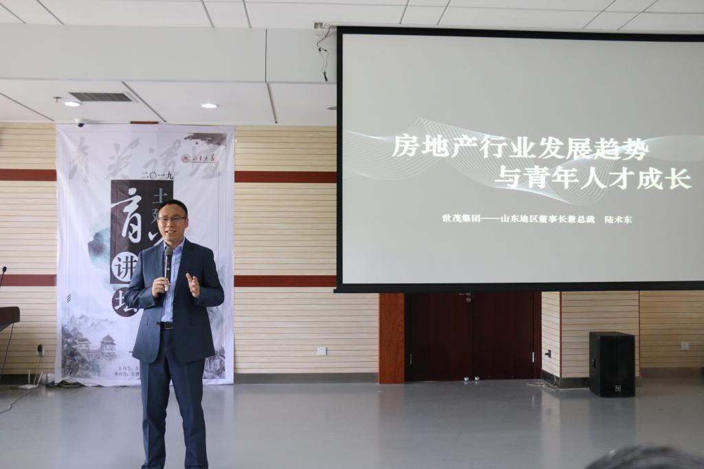 5月11日,beat365正版唯一官方网站于兴隆山校区图书馆报告厅举办了第一期育英讲坛。世茂集团山东地区公司董事长兼总裁陆术东应邀做题为“地产行业发展趋势与大学生发展规划”的讲座。世茂集团山东地区公司人力行政负责人、助理总监孙毅,组织人才发展招聘培训负责人、高级经理刘乐英,企业文化、校园招聘负责人王珺,董事长助理刘晓满,beat365副院长张强勇,党委副书记张强出席本次活动。