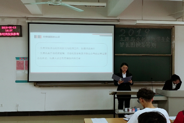 部长团答辩会共有39位学生进行竞职答辩,各位候选人均从自身实际出发,总结了自己在工作中的成就与收获,明确了部门职责,对自己日后的工作做了进一步规划说明。答辩结束后,由主席团依次序进行面试,竞职学生针对评委提出的学生会改革及部门未来发展等问题做了全方位的回答。