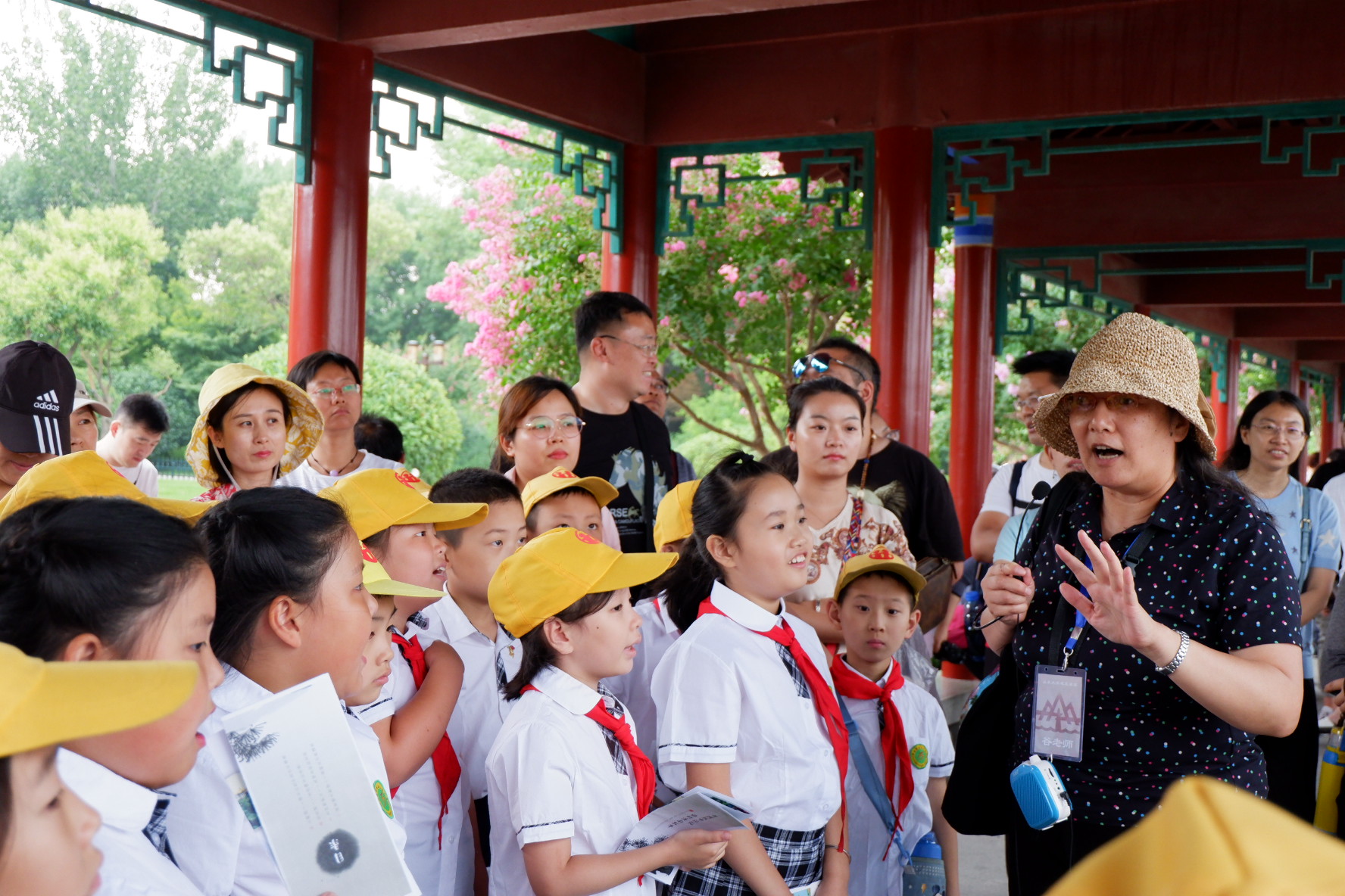 下午2时30分,市博的老师们同团队领队谷健辉老师、队员张吉超、张志伟、王钰林在大明湖风景区南门汇合,孩子们也抵达活动集合点,活动正式开始。谷健辉首先为大家介绍了研学活动的意义,希望孩子们能提升对古建筑的认知,同时建立对文化遗产的保护意识,提高对济南特色建筑的自豪感。