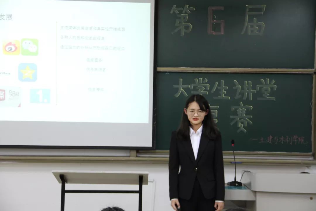 本届大学生讲堂的主题为“载文弄江河,传智舞山川”,各位选手向在场的评委和观众们展示了自己的所思所想。其中2017级建筑一班的万杰介绍了“斜杠青年”的概念,并告诉大家,不止这个社会需要多元化,同时自己的人生选择中也要多留出一些选项,才能体会过程的快乐;2018级土木一班刘博以“昨天风雨兼程,今天山河无恙”为主题来庆祝中华人民共和国成立70周年,列举了祖国70年筚路蓝缕的日子里那些振奋人心的重大事件,对比了昔日的贫穷落后与如今的自立自强,弘扬了爱国主义奋斗精神;2017级建筑一班胡云海的主题为“我们的校园会生长”,他介绍了护鸟活动、潜力空间调研等丰富的项目,用自己的切身行动使校园更加美好;2018级建筑二班柯良瑾则介绍了自媒体的诞生与发展,多角度评价了低门槛自媒体的传播特性,并呼吁当代大学生应该培养独立思考、明辨是非的能力,合理筛选网络信息。选手演讲结束后,梁莹对他们的表现进行了评价,对于着装、PPT的图文比例、时间控制、演讲时的语气起伏等方面进行了细致的点评和指导。