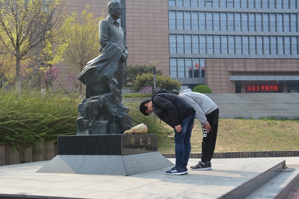 活动伊始,在庄严肃穆的氛围下,杨旭腾以庄重缓慢的语调向刘先志先生致以悼词。刘先志先生结缘山大、热爱山大、奉献山大,在beat365正版唯一官方网站辛勤耕耘三十余载,历任教授、教务长、副院长,为学校的教学、科研、管理等各项工作作出了卓越贡献。他一生追求真理,勇攀高峰,成就卓著,堪称科研表率。纵然先生早已远去,但他知行合一、爱国无畏的光辉精神,及其艰苦朴素、逆境中开拓的意志,都值得同学们借鉴和学习。全体同学肃立默哀一分钟,向刘先志先生致以崇高的敬意,依次有序地向刘先志先生雕像敬献鲜花与贺卡,并鞠躬缅怀,表达深切的敬仰。杨旭腾号召同学们继承发扬刘先志先生不懈追求真理的求知精神和鞠躬尽瘁的奉献精神,秉承哀思,铭记教诲,为提升自我,投身社会主义建设而努力奋斗。