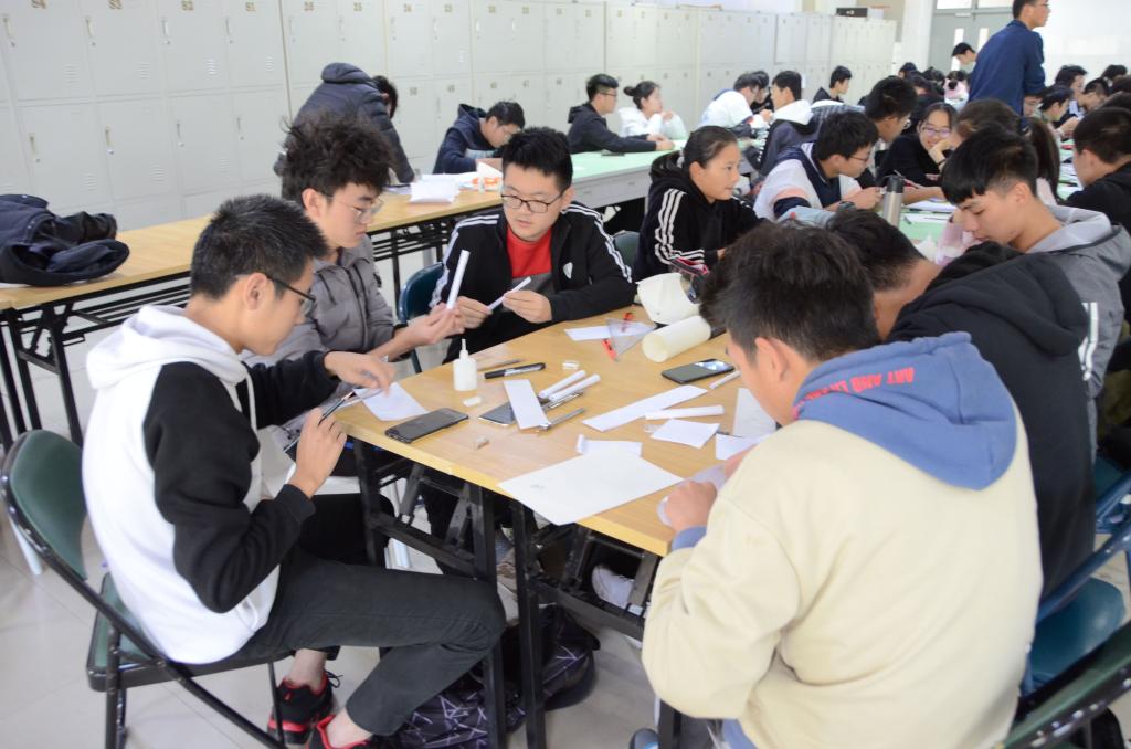 上午8点30分,主持人宣读比赛规则后大赛正式开始,各队伍迅速投入到模型制作过程中。每位队员精神饱满,专注于自己的工作,细心严谨地完成每一个部件的制作。根据大赛要求,参赛队伍需在规定的两个小时内,利用5张A4纸和胶水、剪刀等简易工具制作出高度不低于150mm的模型。承办方将从自重和承重两个方面对参赛模型做出评判,即自重越轻且承重能力越强的模型所属队伍获胜。