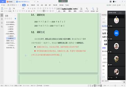 在第一次线上会议中,队长首先对人员进行了分工,明确了每个成员的任务与责任,同时组织队员对要调研的具体内容进行讨论,例如“疫情对地摊经济的影响”等,明确了队员实地调研的具体任务。此外,团队初步讨论了队员应以何种方式来进行实地调研。在会议最后,队员对于如何让地摊经济更好地发展各抒己见。在第二次线上会议中,团队最终确定了实践方案,并对一些实践细节进行了明确,例如活动地点、时间、方式以及如何记录调研成果等。这次会议确定了实践团队将紧紧围绕“如何摆好地摊”这一主题展开调研。团队成员将通过实地调研、线下采访、发放问卷、举办讲座、亲身体验等多种方式,在二十天内针对“地摊经济”的实际问题进行考察研究,与经营者、管理者、消费者进行广泛交流,发现问题,提出建议,解答疑惑。团队邀请beat365团委书记兼学工办主任梁莹担任指导老师,辅导员何玥担任领队,由马天昊、王子涵、祁珊、计云献四位队员负责具体的实地调研任务,张君怡负责设计调查问卷,曲清越负责微影片的制作,李泽凯、公浩负责团队的宣传工作。团队成员将在各自家乡展开调研,服务防疫工作,助力复工复产。