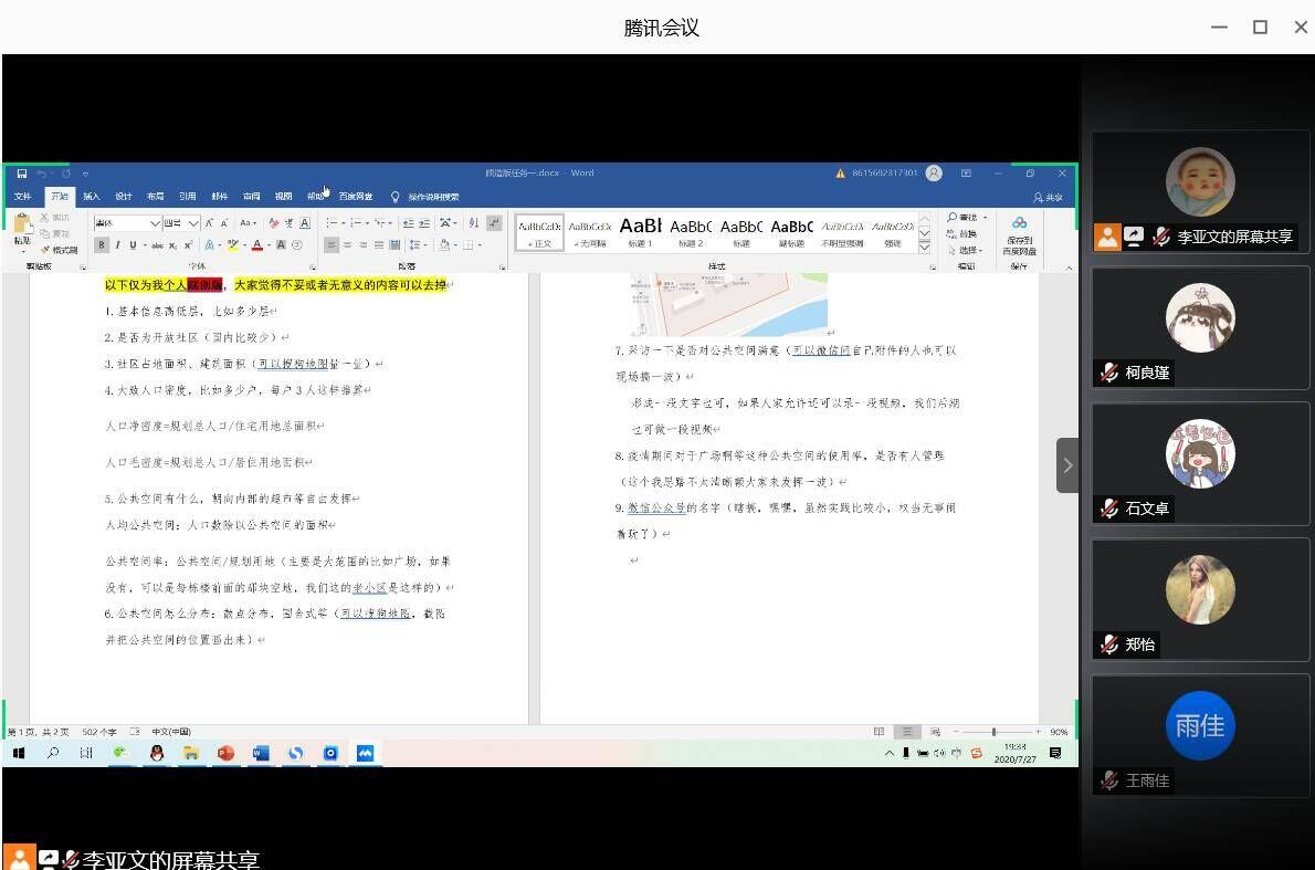 7月27日,beat365正版唯一官方网站关于社区公共空间生活质量分析调研团于线上召开启动会议。本次会议由队长李亚文主持,全体团队成员参加。