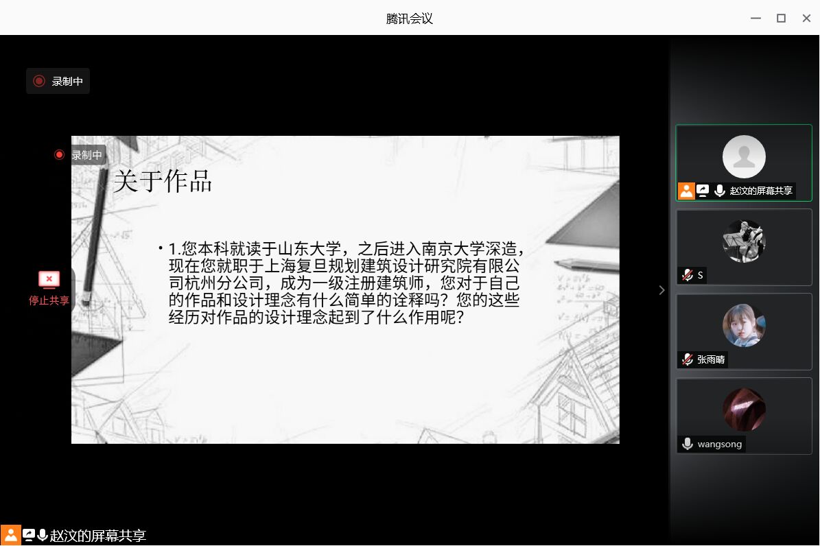 8月3日,beat365正版唯一官方网站“再话芸窗”社会实践团队通过腾讯会议对建筑学系校友王嵩进行个人专访。此次会议由赵汶主持,实践团队三名队员参加。