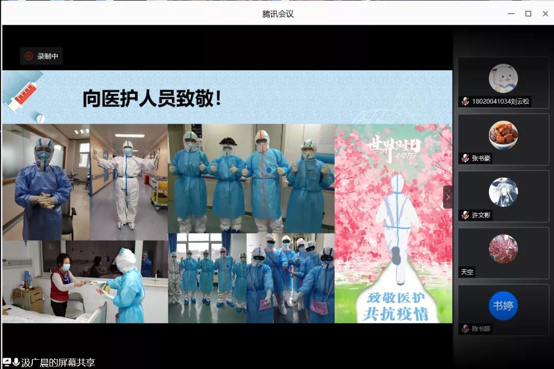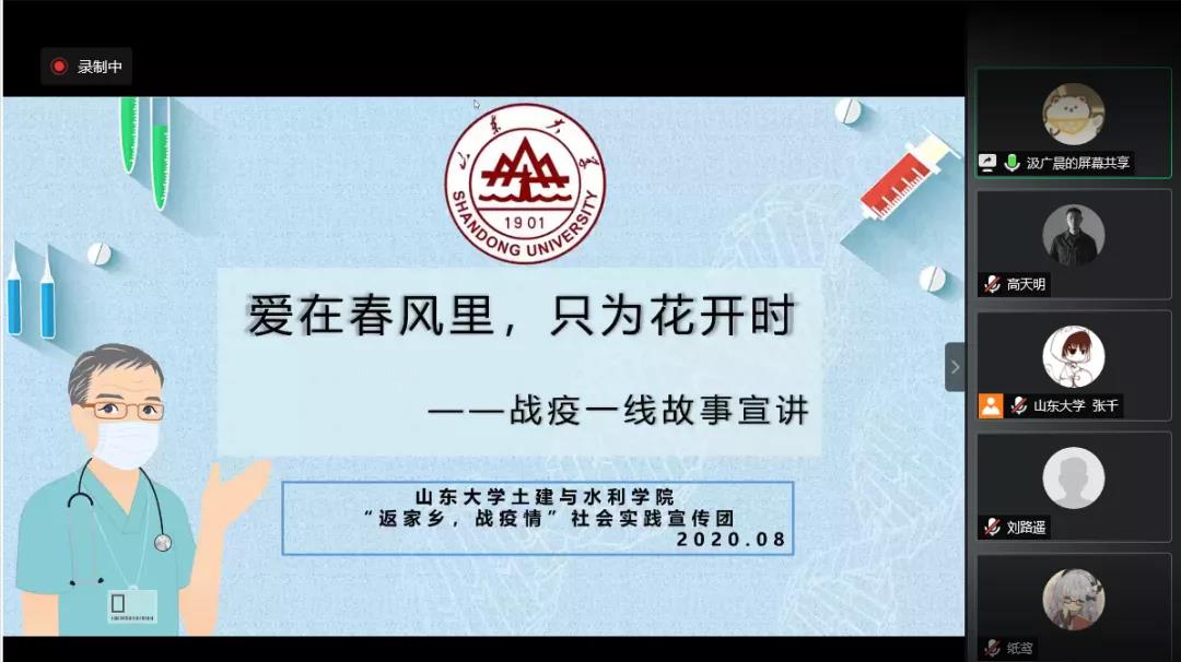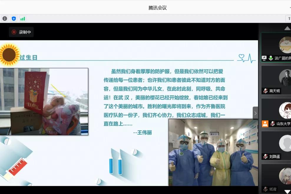 本次宣讲以“爱在春风里,只为花开时”为主题,围绕战疫一线医务人员的故事展开。汲广晨以医务人员的战疫日记为载体,用一线医务工作者的口吻讲述战疫故事。支援湖北医疗队成员王伟丽与所在小组成员细心的发现患者的生日,精心准备“生日大礼包”;齐鲁医院第四批援鄂医疗队队员郭海鹏出发去武汉前收到父亲“国家有难,匹夫有责,武汉的同胞们正在忍受煎熬,越是艰险越向前”。的微信支持;支援湖北医疗队成员蒲林哲被康复出院的大姨告别时的心里话感动得热泪盈眶;支援湖北医疗队成员高帅收到一位大叔颤颤巍巍地交给他的一个旧药盒,在药盒的内面,大叔密密麻麻地写满了感谢的话语;山东省第六批援湖北医疗队队长马承恩和“樱花医疗队”带每一位患者走进春天;支援湖北医疗队成员徐亚楠和队友临时组建的“理发店”得到大叔“手法专业”的称赞;因一碗营养糊被老大爷记住名字的刘肖雅感到一份发自内心的信任……一个个名字,勇敢前行,一个个故事,正在发生。汲广晨最后提出要关心爱护医务人员,与他们站在一起、想在一起,成为他们最坚强的后盾。