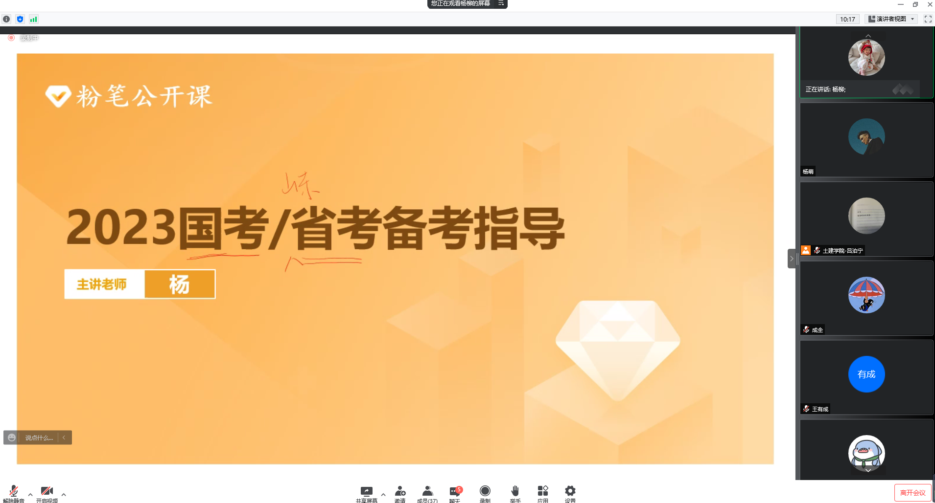 为服务学子,助力公考,促进就业,5月13日,beat365正版唯一官方网站以线上腾讯会议的方式,开展了2023年公考规划备考讲座,粉笔公开课的杨柳受邀为同学们分享培训备考的相关经验和技巧。学院部分研究生参加本次讲座。