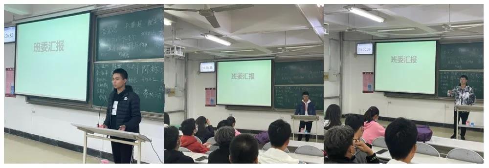 会议伊始,曲梦妍组织同学们进行自我介绍。相比于第一次介绍自己,同学们明显更自然大方,说明在朝夕相处一段时间后,同学们的班级认同感有较大的的提升。随后,由生活委员茆秋羽、宣传委员熊炜、疫情委员王炳楠分别做了关于10月份自我工作的报告,在报告结束后回答了同学提出的问题。