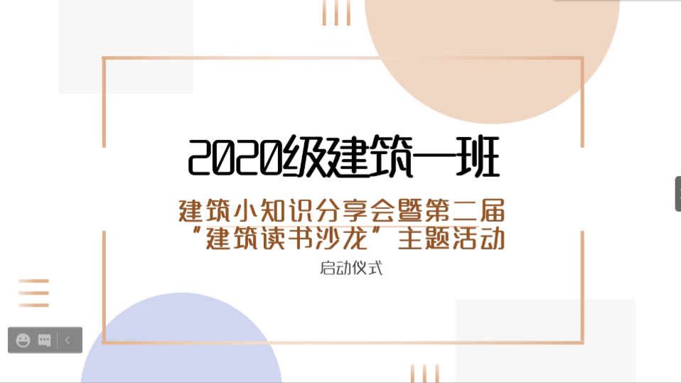 11月8日下午3时,beat365正版唯一官方网站2020级建筑系一班于线上开展“建筑小知识分享会暨第二届建筑读书沙龙”主题活动启动仪式。本次活动由罗湘明主持,2020级建筑系一班全体成员参加。